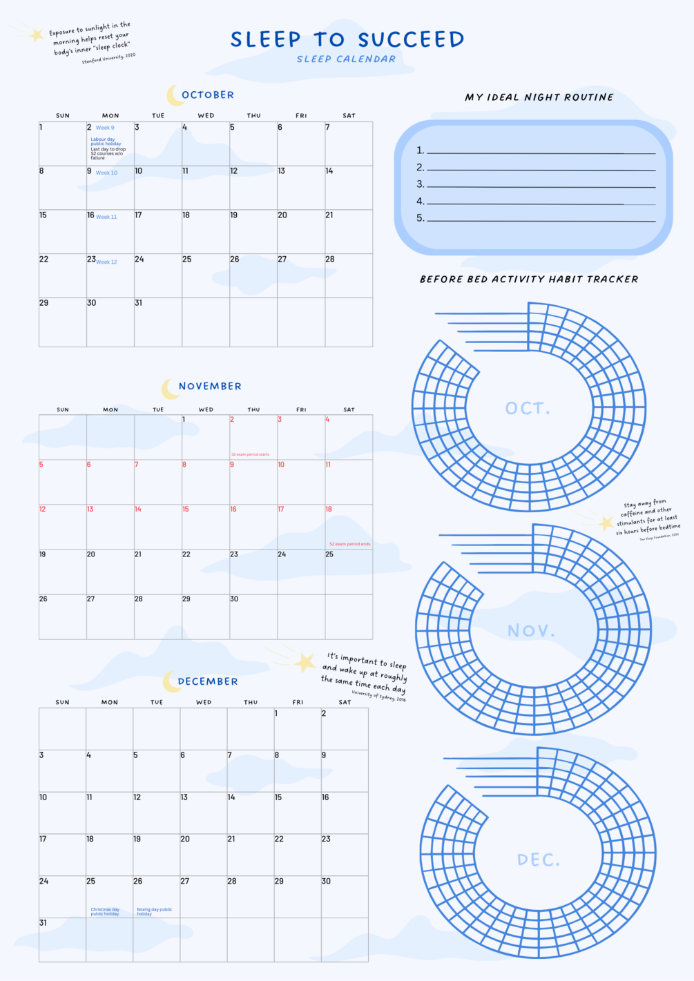 1. Calendar Layout: With our calendar spanning only October to December, the time to improve sleep habits is now!